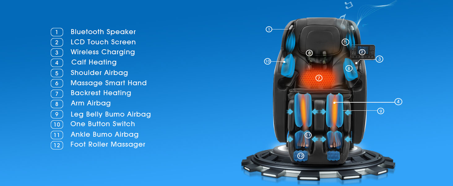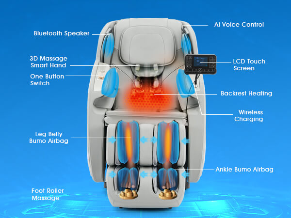 This chair offers a wide range of customization with 5 degrees of massage intensity, 6 massage techniques, and 5 auto modes. Users can find the perfect massage mode for their specific needs, and the chair returns to its initial position with a manual power-off function.